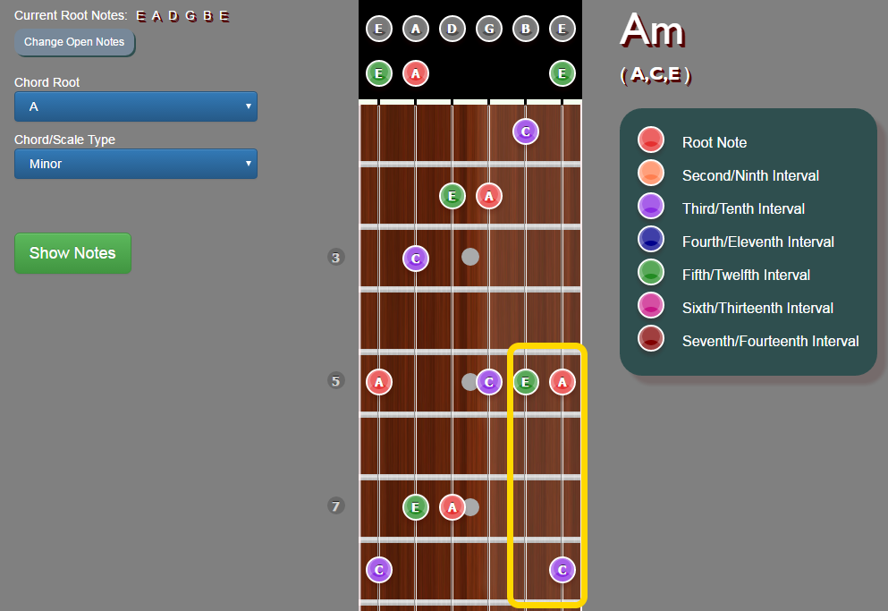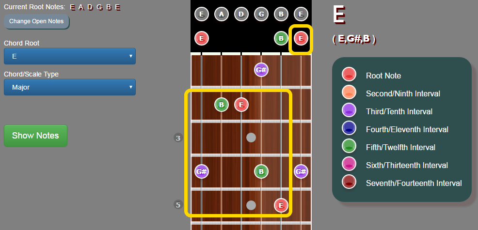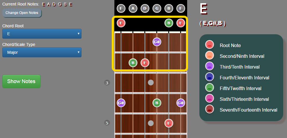 By using the fretboard display, we can use any combination of notes that make up an E chord, which is displayed on the top right of the fretboard (E, G#, B).