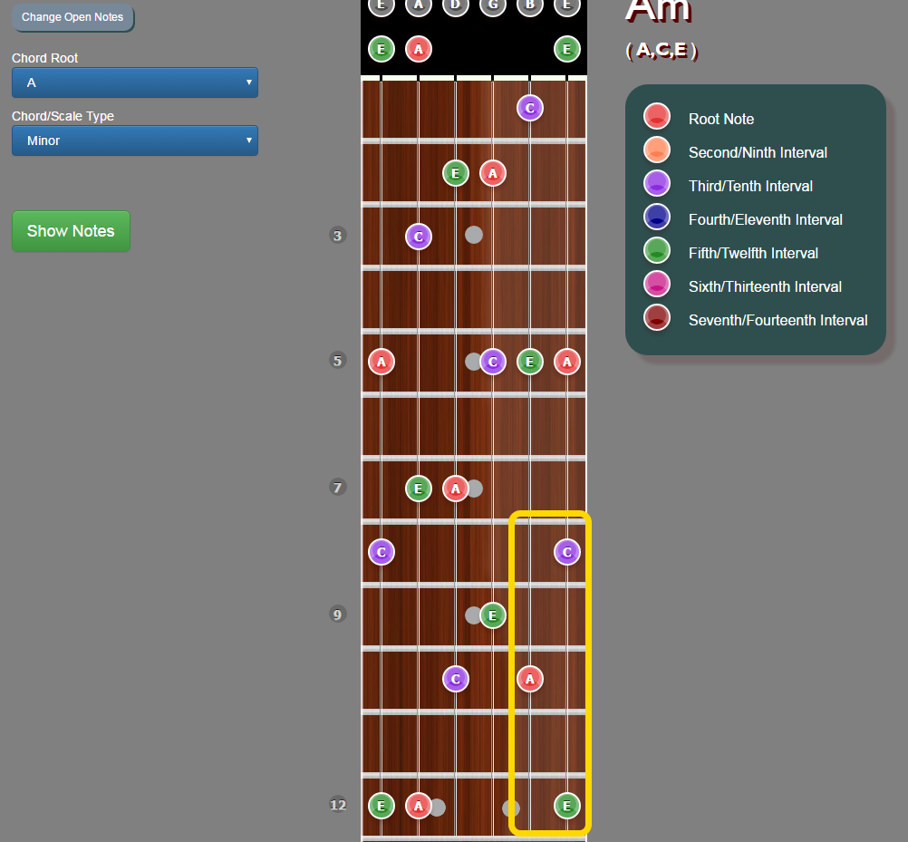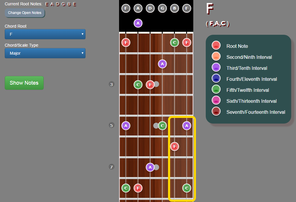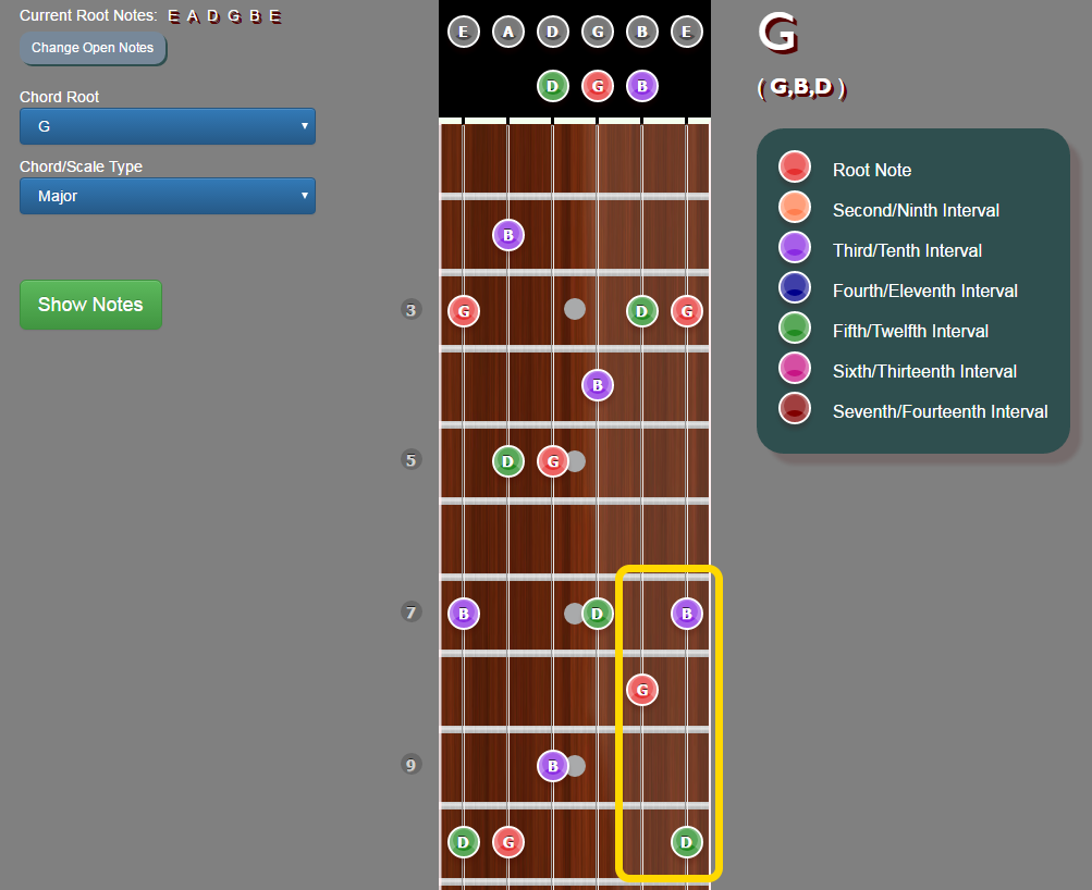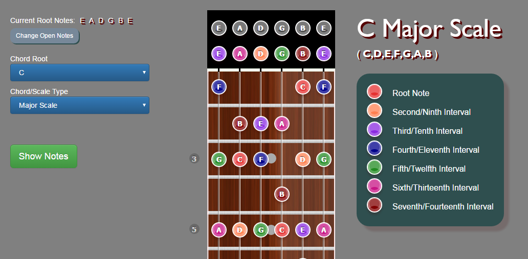 Notice the current guitar root notes on top left, as well as the top of the fretboard