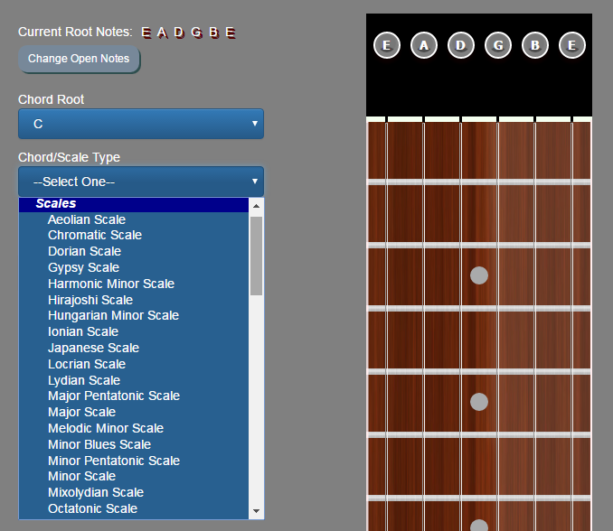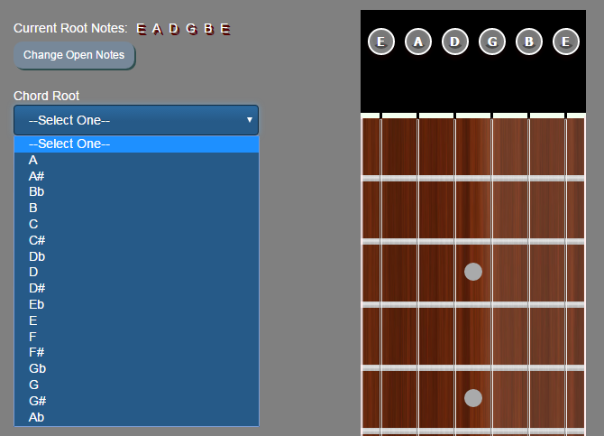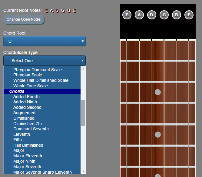 Clicking the "Change Open Notes" button displays lists for each string. You can change each string to any note that you like.