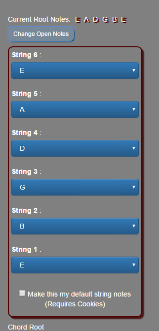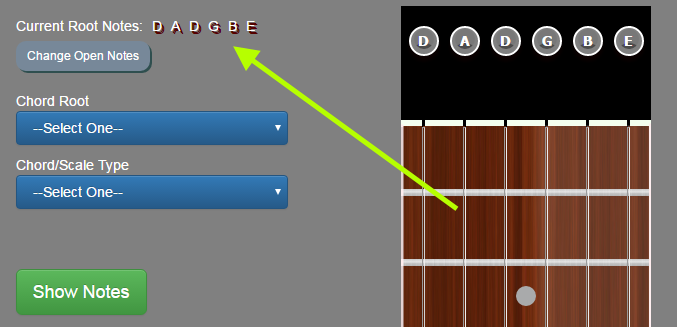 After you selected the strings you want, click the "Show Notes" button. This will change the root notes and display the notes on the new tuning. If you clicked the checkbox "Make this my default string notes", it will save a cookie to your device.