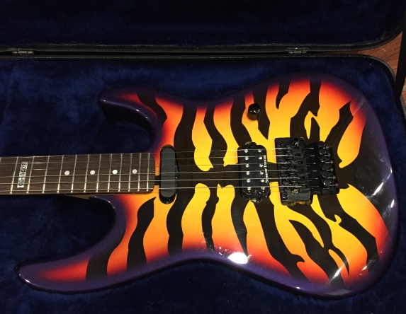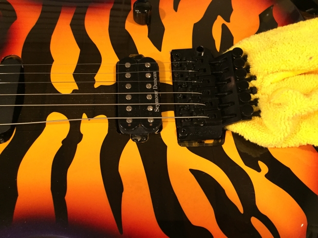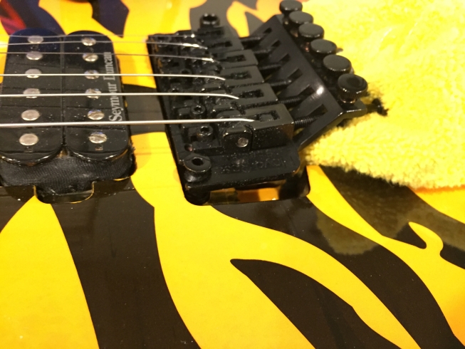 Next, I put a towel behind the Floyd Rose tremolo. The towel servers two purposes. When we loosen the strings, the Floyd would be sunken into the body, if the towel wasn't there. Second, if we roll the towel up enough, it will cause the tremolo to actually pitch upward, thus beginning the process of loosening the string before ever touching a tuning peg. Notice how the back of the tremolo, which is normally parallel to the body, is now pitching up, and releasing some tension on the strings.