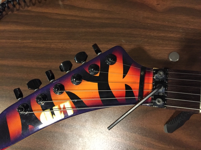 If you look at the headstock (below), you'll notice there is no access to the truss rod. The first step to access the truss rod is to unlock the string locks with an Allen key.
