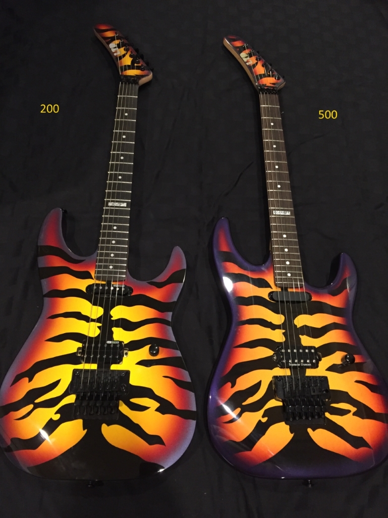 There are some major differences in the color, and how it was painted. The 500 is darker, mainly because the black tiger stripes are bigger. Also, there is more red/orange on the headstock.