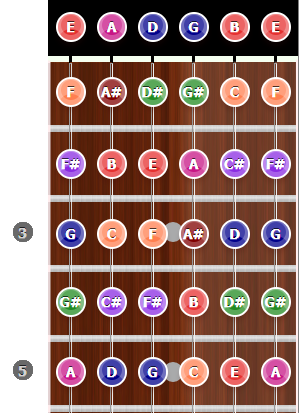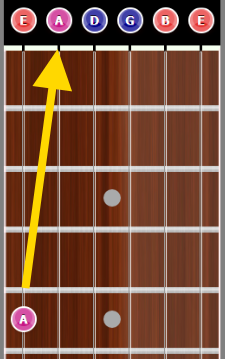 For example, on the low E (6th) string, the fifth fret (in pink/fushia) is an A note.