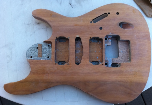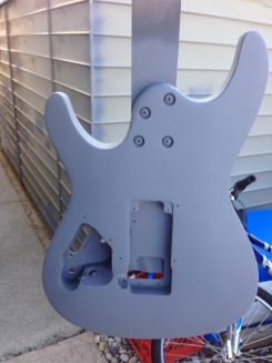 After a couple of years, I had a small scratch in the surface of the guitar. Since there wasn't any clear coat on it, I couldn't just buff it out. So, I tried applying more Tung oil to the area, but it simply couldn't match the existing aged tung oil look. It was back to the sanding. I then figured that I had nothing to lose, lets really go for it. I sanded it and did a primer coat.