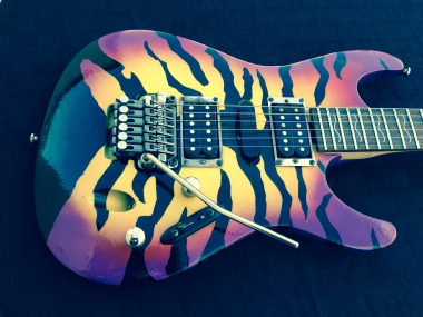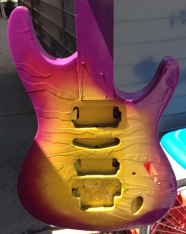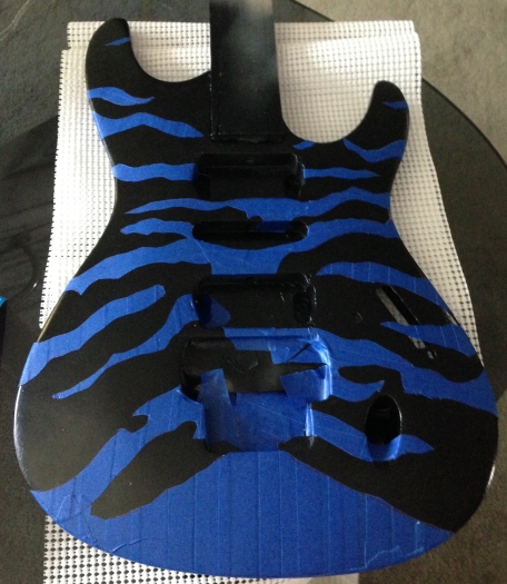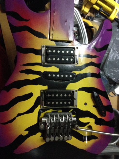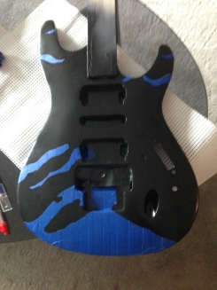 I was very nervous that it would run once I started putting on the clear coat. I waited another week, to make sure the existing paint cured (as well as the sharpie). Just in case the sharpie ran, I wanted to see what it was going to look like when done. Before starting the clear coat, I carefully laid the pickups and the ZR tremolo in the body and took this picture.