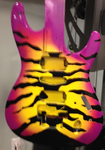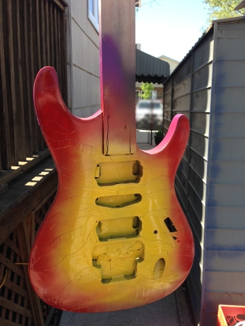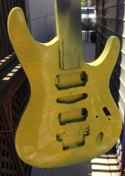 Now came the most intense part. It was one of those "get it right, or start over" moments. I started with the yellow coat. I did the whole front of the guitar. In hindsight, I should have done much less on the edges, since they were going to be "bursted" in darker colors.