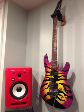 I let the guitar dry for about 40 minutes and took off the tape. This is where I realized that I shouldn't have painted the yellow near the edges. After pulling the tape off, I noticed there was a very thin, but noticeable layer of yellow under the plum. After letting the guitar dry for about a week, I used a thin sharpie around the stripe edges to cover the thin yellow under the plum.
