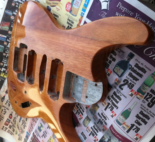 Once I saw the guitar stripped, I wondered how it would look with the wood treated with Tung Oil. After applying it on a small area on the back of the guitar, my whole outlook changed. I made the guitar completely bare with Tung oil finish.